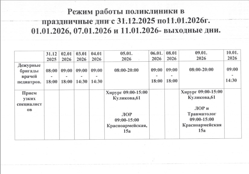 Режим работы поликлиники в праздничные дни с 31.12.2025 по 11.01.2026